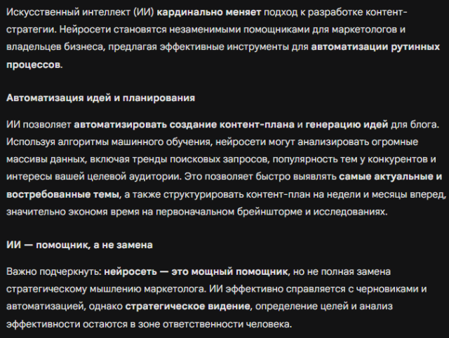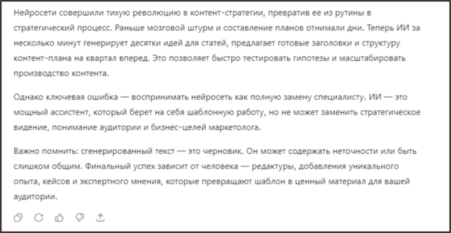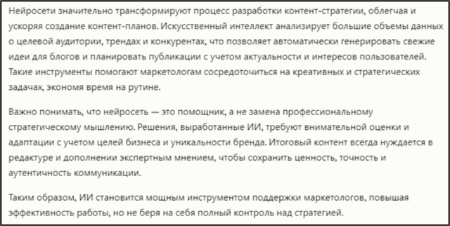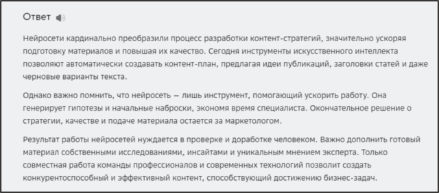 Пример текста о влиянии нейросетей на контент-стратегию, написанного YandexGPT