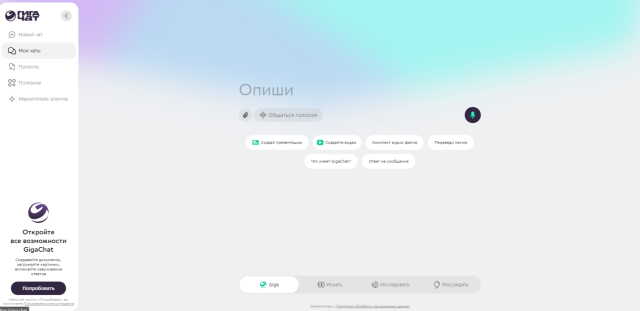GigaChat — это российская многомодальная языковая модель, разработанная Сбером. Платформа позиционируется как универсальный ассистент с поддержкой генерации и анализа текста, изображений, а также возможностью распознавания речи. Это отличный вариант ИИ для написания текстов на русском языке.